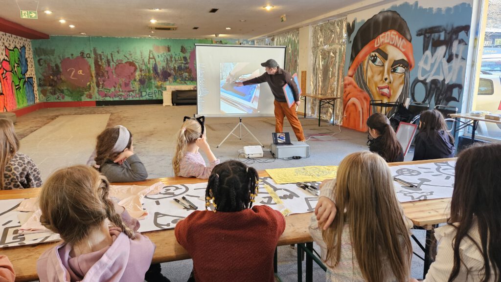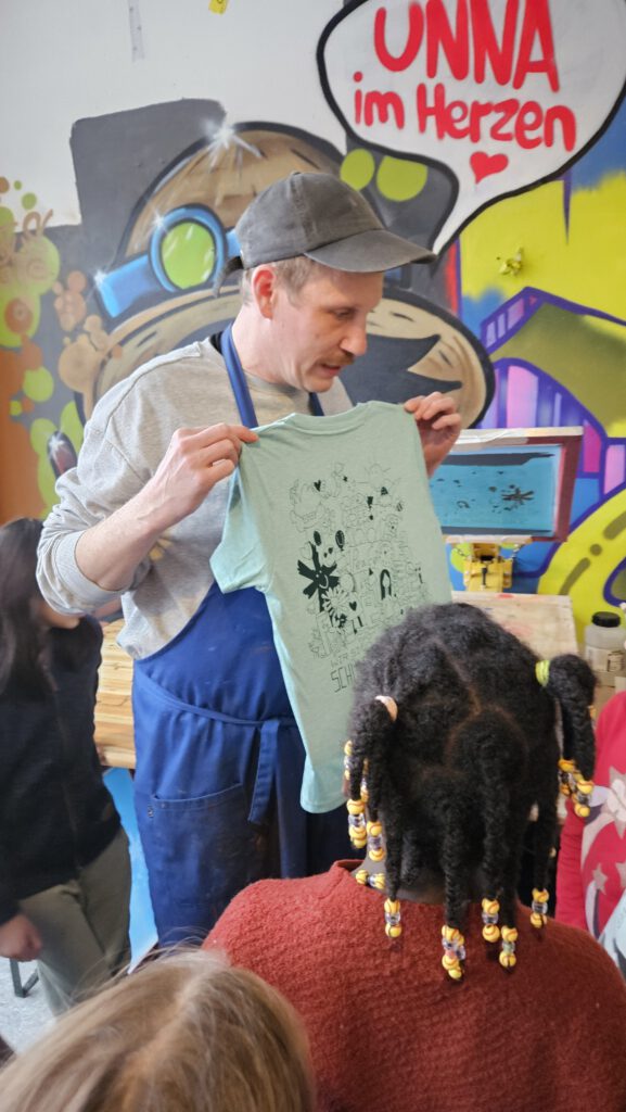 Am ersten Tag haben unsere Eltern uns hingefahren. Dort haben wir Felix, den Künstler, kennengelernt. Er hat uns alles erklärt. Zuerst haben wir viele Ideen gesammelt und ganz viele Doodles gemalt. Das sind kleine Zeichnungen. Wir haben uns überlegt, dass die Doodles zu unserem Schülerparlament passen sollten. Also haben wir Herzen, Hotdogs, Peacezeichen gemalt oder Wörter wie Schülerparlament oder FBS geschrieben. Felix hat gesagt, dass aus unseren Zeichnungen später ein Logo gemacht wird und wir das dann auf die T-Shirts per Siebdruck drucken.