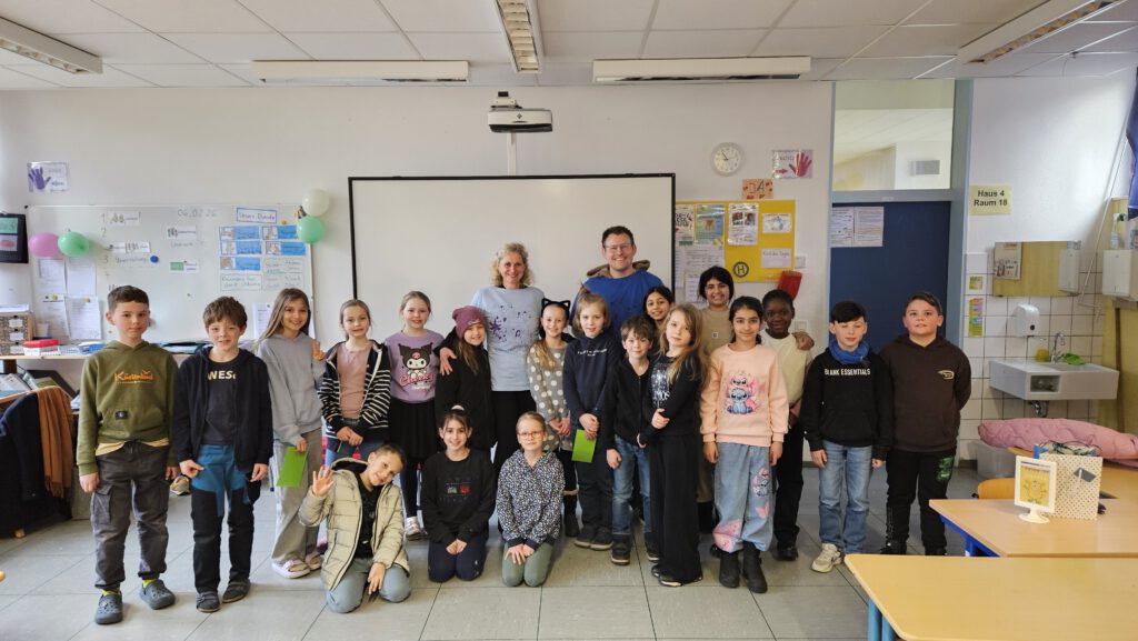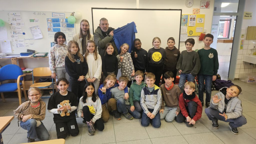 Eine weitere Woche später haben wir Frau Schertel und Herrn Flormann gefragt, wann sie Zeit für uns haben. Wir wollten ihnen nämlich auch ein selbst bedrucktes T-Shirt schenken. Vorher haben wir überlegt, was wir ihnen sagen möchten und haben das Gruppenfoto vom ersten Projekttag mit Felix dazugelegt. Frau Schertel und Herr Flormann haben sich sehr gefreut. Wir sind immer so dankbar, weil sie uns bei allem unterstützen. Sie haben gesagt, dass sie sich sehr darüber freuen, dass wir immer unser Bestes geben, um die Schule zu verschönern.